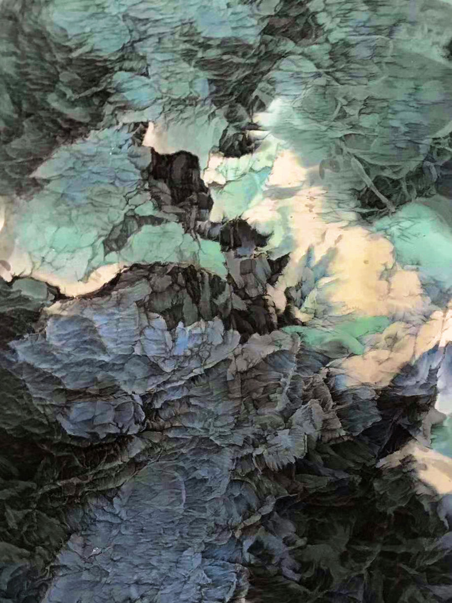 "Zen Flow: Mountains of the Mind" embodies a journey through the spiritual essence of Zen Buddhism blended with the abstract forms of traditional Chinese landscape painting. This piece is inspired by Jeanne's spiritual experience as a female Buddhist Monk (Bhikkhuni) after surviving from lung cancer. It reflects the "landscape within the mind," capturing the Buddhist concept of inner tranquility and the ancient philosophical doctrine of the "Three Distances" in Chinese art. These distances—high (the vertical dimension), deep (the horizontal expansion), and level (spatial variation across the plane)—serve as metaphors for life's spiritual and existential journeys. Removed from the digital realm, this artwork focuses on the meditative and introspective experience, inviting viewers to immerse themselves in a painted pilgrimage through symbolic landscapes and to become "mountain dwellers" in their quest for inner peace.